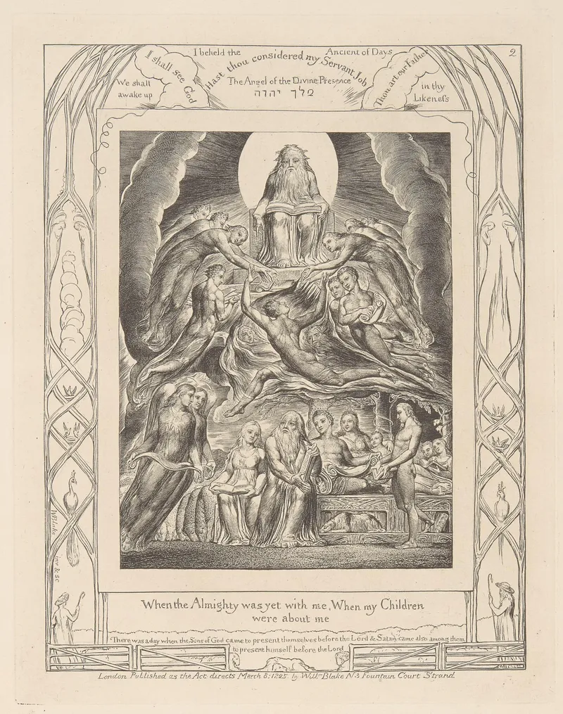 Public domain via Wikimedia Commons. William Blake (1757–1827), Illustrations of the Book of Job (engraved 1826) and related biblical paintings, tempera prints, and watercolors.