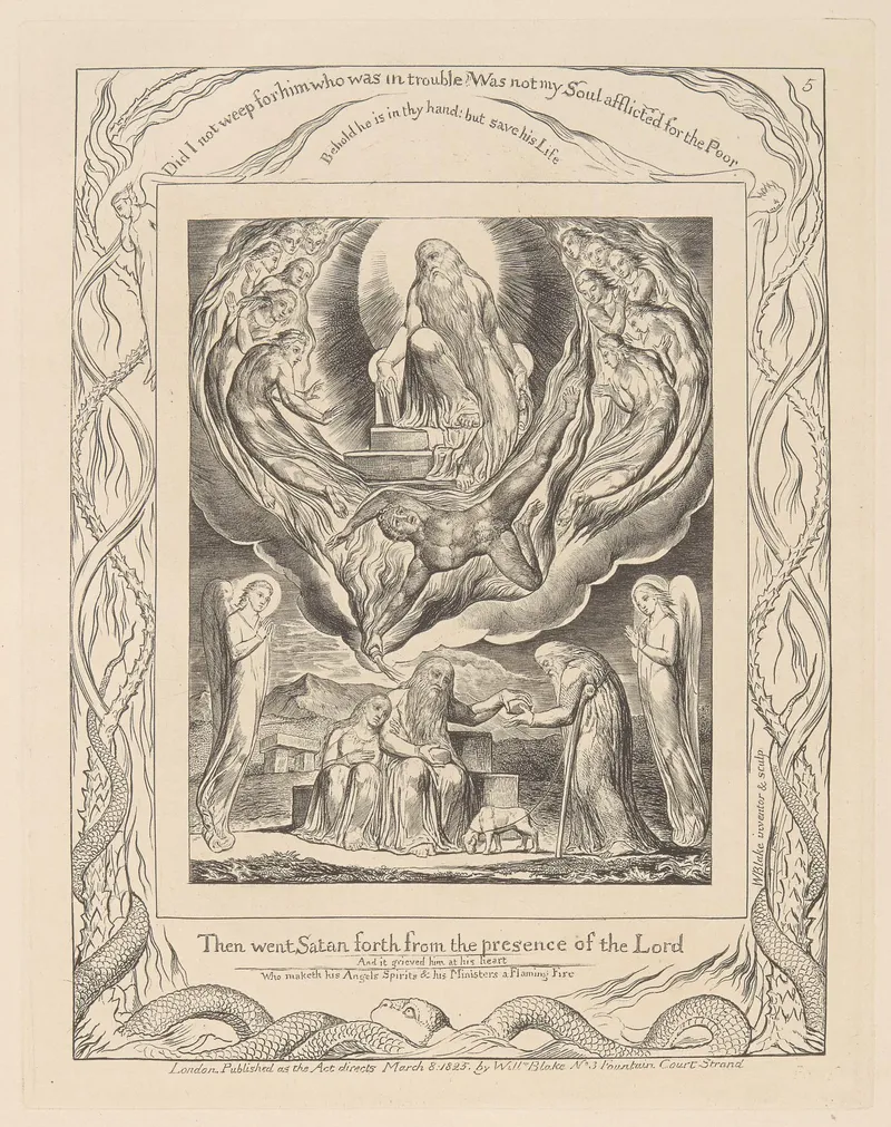 View full resolution·Public domain via Wikimedia Commons. William Blake (1757–1827), Illustrations of the Book of Job (engraved 1826) and related biblical paintings, tempera prints, and watercolors.·Source