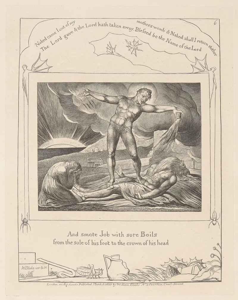 Public domain via Wikimedia Commons. William Blake (1757–1827), Illustrations of the Book of Job (engraved 1826) and related biblical paintings, tempera prints, and watercolors.