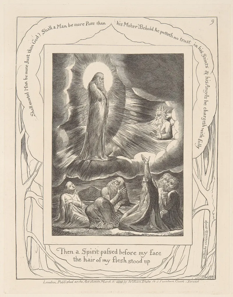 Public domain via Wikimedia Commons. William Blake (1757–1827), Illustrations of the Book of Job (engraved 1826) and related biblical paintings, tempera prints, and watercolors.