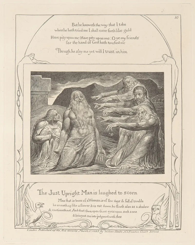 Public domain via Wikimedia Commons. William Blake (1757–1827), Illustrations of the Book of Job (engraved 1826) and related biblical paintings, tempera prints, and watercolors.