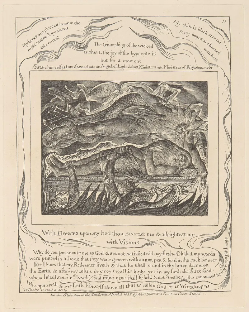 Public domain via Wikimedia Commons. William Blake (1757–1827), Illustrations of the Book of Job (engraved 1826) and related biblical paintings, tempera prints, and watercolors.