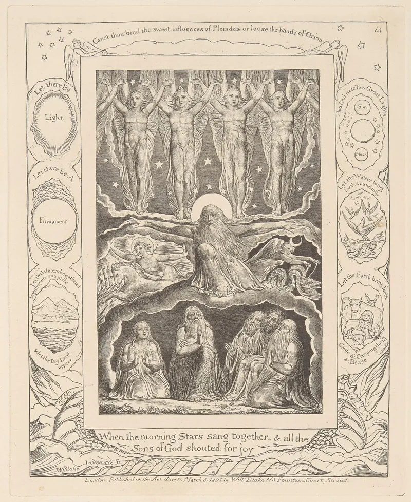 Public domain via Wikimedia Commons. William Blake (1757–1827), Illustrations of the Book of Job (engraved 1826) and related biblical paintings, tempera prints, and watercolors.