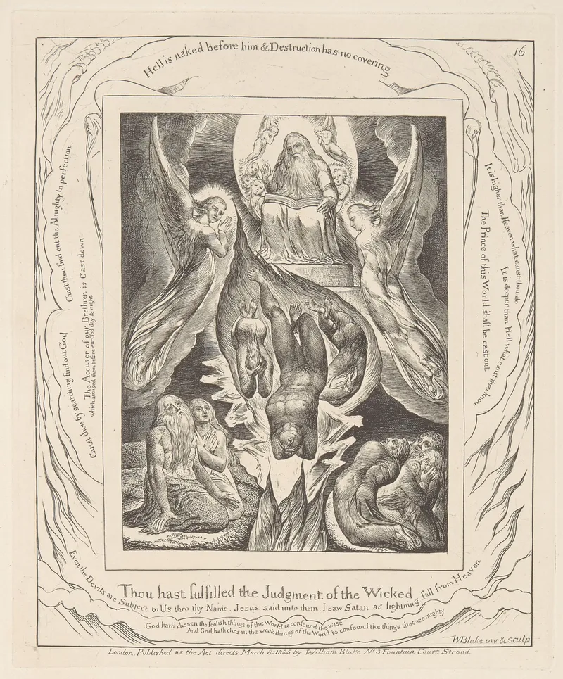 Public domain via Wikimedia Commons. William Blake (1757–1827), Illustrations of the Book of Job (engraved 1826) and related biblical paintings, tempera prints, and watercolors.