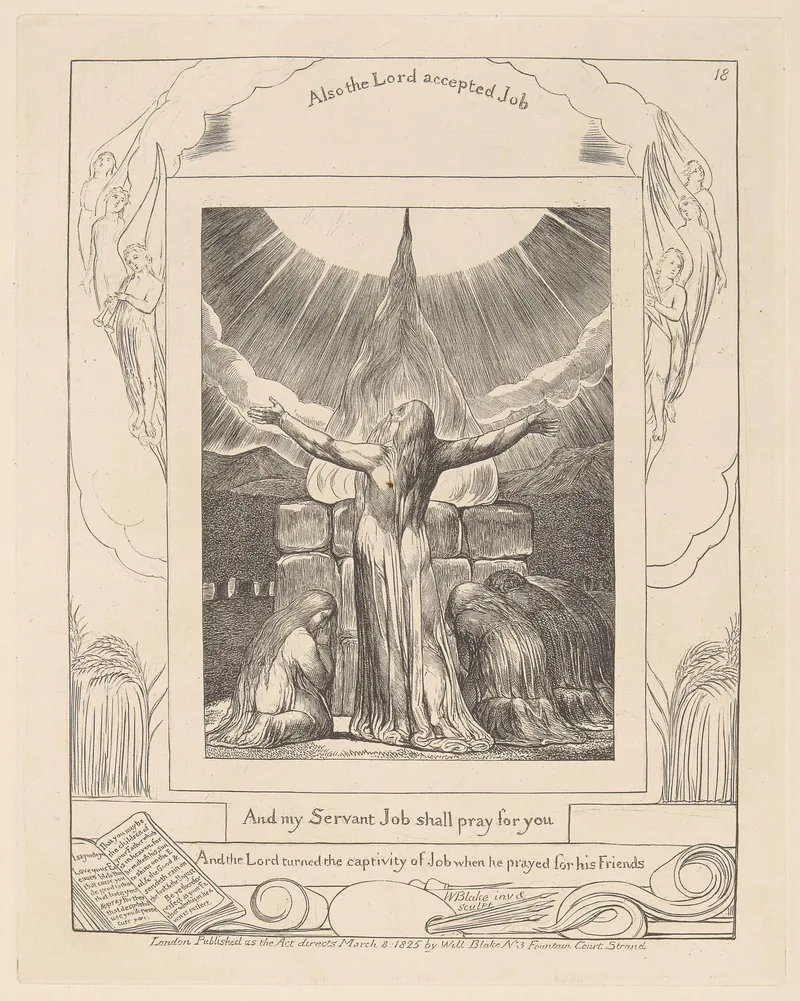 Public domain via Wikimedia Commons. William Blake (1757–1827), Illustrations of the Book of Job (engraved 1826) and related biblical paintings, tempera prints, and watercolors.