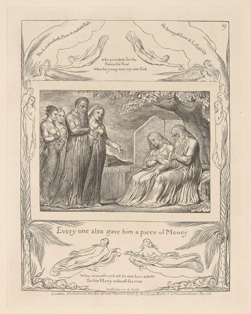 Public domain via Wikimedia Commons. William Blake (1757–1827), Illustrations of the Book of Job (engraved 1826) and related biblical paintings, tempera prints, and watercolors.