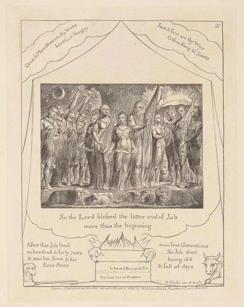 Public domain via Wikimedia Commons. William Blake (1757–1827), Illustrations of the Book of Job (engraved 1826) and related biblical paintings, tempera prints, and watercolors.
