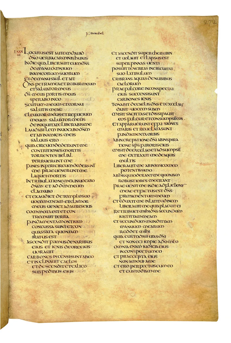 Folio of the Codex Amiatinus, the oldest surviving complete Latin Vulgate manuscript, made c. 700 AD at the twin Northumbrian monasteries of Monkwearmouth and Jarrow under Abbot Ceolfrith. Approximately corresponds to 1 Chronicles 10 in Vulgate book order. The page shows the actual eighth-century insular-uncial script as it would have been read by the monks who produced it for Pope Gregory II.