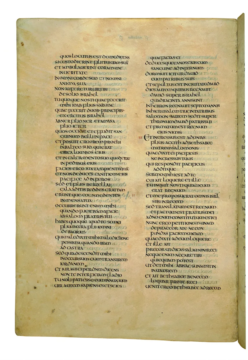 Folio of the Codex Amiatinus, the oldest surviving complete Latin Vulgate manuscript, made c. 700 AD at the twin Northumbrian monasteries of Monkwearmouth and Jarrow under Abbot Ceolfrith. Approximately corresponds to 1 Chronicles 18 in Vulgate book order. The page shows the actual eighth-century insular-uncial script as it would have been read by the monks who produced it for Pope Gregory II.