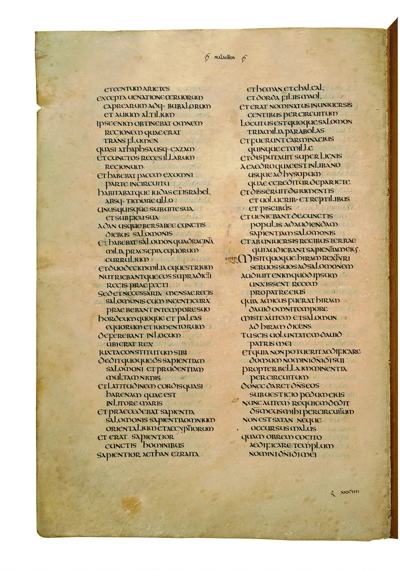 Folio of the Codex Amiatinus, the oldest surviving complete Latin Vulgate manuscript, made c. 700 AD at the twin Northumbrian monasteries of Monkwearmouth and Jarrow under Abbot Ceolfrith. Approximately corresponds to 1 Chronicles 22 in Vulgate book order. The page shows the actual eighth-century insular-uncial script as it would have been read by the monks who produced it for Pope Gregory II.