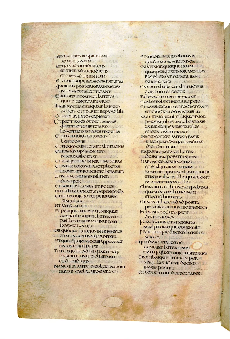 Folio of the Codex Amiatinus, the oldest surviving complete Latin Vulgate manuscript, made c. 700 AD at the twin Northumbrian monasteries of Monkwearmouth and Jarrow under Abbot Ceolfrith. Approximately corresponds to 1 Chronicles 26 in Vulgate book order. The page shows the actual eighth-century insular-uncial script as it would have been read by the monks who produced it for Pope Gregory II.