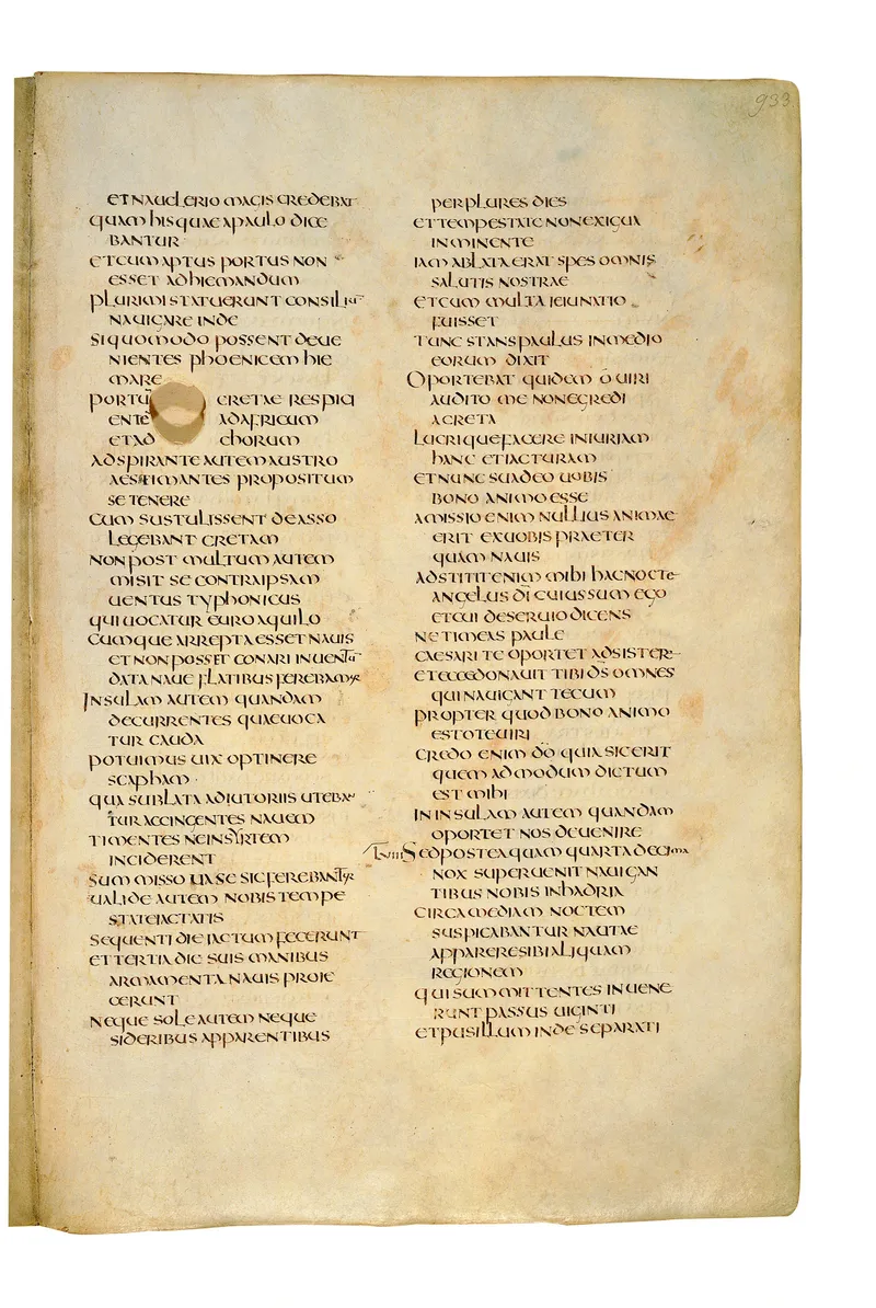 Folio of the Codex Amiatinus, the oldest surviving complete Latin Vulgate manuscript, made c. 700 AD at the twin Northumbrian monasteries of Monkwearmouth and Jarrow under Abbot Ceolfrith. Approximately corresponds to 1 Corinthians 3 in Vulgate book order. The page shows the actual eighth-century insular-uncial script as it would have been read by the monks who produced it for Pope Gregory II.