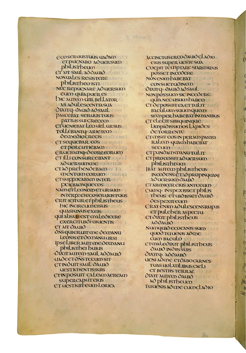 Folio of the Codex Amiatinus, the oldest surviving complete Latin Vulgate manuscript, made c. 700 AD at the twin Northumbrian monasteries of Monkwearmouth and Jarrow under Abbot Ceolfrith. Approximately corresponds to 1 Kings 11 in Vulgate book order. The page shows the actual eighth-century insular-uncial script as it would have been read by the monks who produced it for Pope Gregory II.