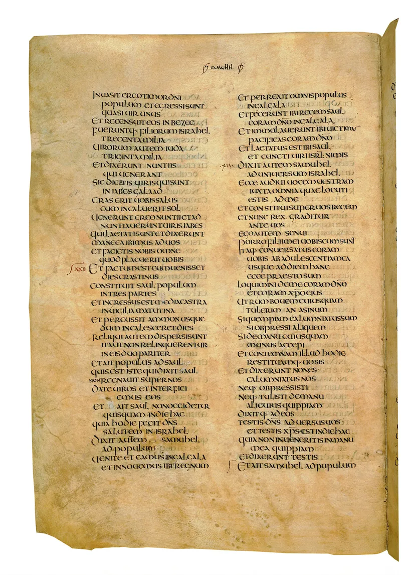 Folio of the Codex Amiatinus, the oldest surviving complete Latin Vulgate manuscript, made c. 700 AD at the twin Northumbrian monasteries of Monkwearmouth and Jarrow under Abbot Ceolfrith. Approximately corresponds to 1 Kings 2 in Vulgate book order. The page shows the actual eighth-century insular-uncial script as it would have been read by the monks who produced it for Pope Gregory II.