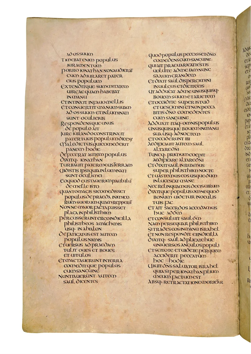 Folio of the Codex Amiatinus, the oldest surviving complete Latin Vulgate manuscript, made c. 700 AD at the twin Northumbrian monasteries of Monkwearmouth and Jarrow under Abbot Ceolfrith. Approximately corresponds to 1 Kings 6 in Vulgate book order. The page shows the actual eighth-century insular-uncial script as it would have been read by the monks who produced it for Pope Gregory II.