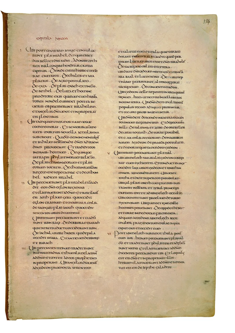 Folio of the Codex Amiatinus, the oldest surviving complete Latin Vulgate manuscript, made c. 700 AD at the twin Northumbrian monasteries of Monkwearmouth and Jarrow under Abbot Ceolfrith. Approximately corresponds to 1 Samuel 11 in Vulgate book order. The page shows the actual eighth-century insular-uncial script as it would have been read by the monks who produced it for Pope Gregory II.