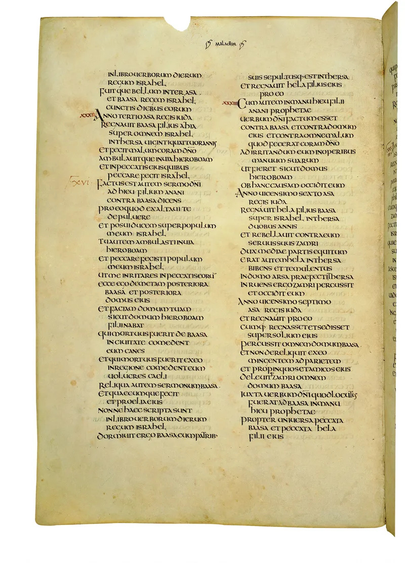 Folio of the Codex Amiatinus, the oldest surviving complete Latin Vulgate manuscript, made c. 700 AD at the twin Northumbrian monasteries of Monkwearmouth and Jarrow under Abbot Ceolfrith. Approximately corresponds to 2 Chronicles 11 in Vulgate book order. The page shows the actual eighth-century insular-uncial script as it would have been read by the monks who produced it for Pope Gregory II.