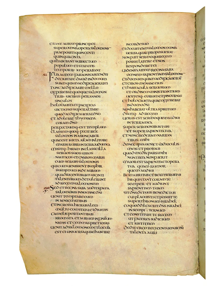Folio of the Codex Amiatinus, the oldest surviving complete Latin Vulgate manuscript, made c. 700 AD at the twin Northumbrian monasteries of Monkwearmouth and Jarrow under Abbot Ceolfrith. Approximately corresponds to 2 Chronicles 2 in Vulgate book order. The page shows the actual eighth-century insular-uncial script as it would have been read by the monks who produced it for Pope Gregory II.