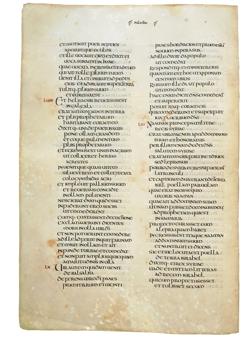 Folio of the Codex Amiatinus, the oldest surviving complete Latin Vulgate manuscript, made c. 700 AD at the twin Northumbrian monasteries of Monkwearmouth and Jarrow under Abbot Ceolfrith. Approximately corresponds to 2 Chronicles 27 in Vulgate book order. The page shows the actual eighth-century insular-uncial script as it would have been read by the monks who produced it for Pope Gregory II.