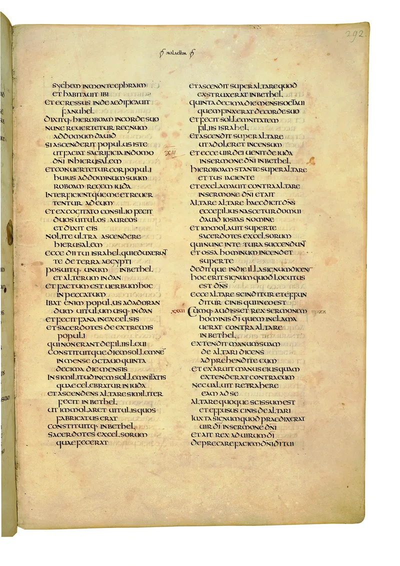 Folio of the Codex Amiatinus, the oldest surviving complete Latin Vulgate manuscript, made c. 700 AD at the twin Northumbrian monasteries of Monkwearmouth and Jarrow under Abbot Ceolfrith. Approximately corresponds to 2 Chronicles 7 in Vulgate book order. The page shows the actual eighth-century insular-uncial script as it would have been read by the monks who produced it for Pope Gregory II.