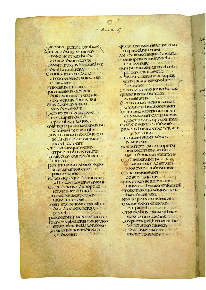 Folio of the Codex Amiatinus, the oldest surviving complete Latin Vulgate manuscript, made c. 700 AD at the twin Northumbrian monasteries of Monkwearmouth and Jarrow under Abbot Ceolfrith. Approximately corresponds to 2 Kings 19 in Vulgate book order. The page shows the actual eighth-century insular-uncial script as it would have been read by the monks who produced it for Pope Gregory II.
