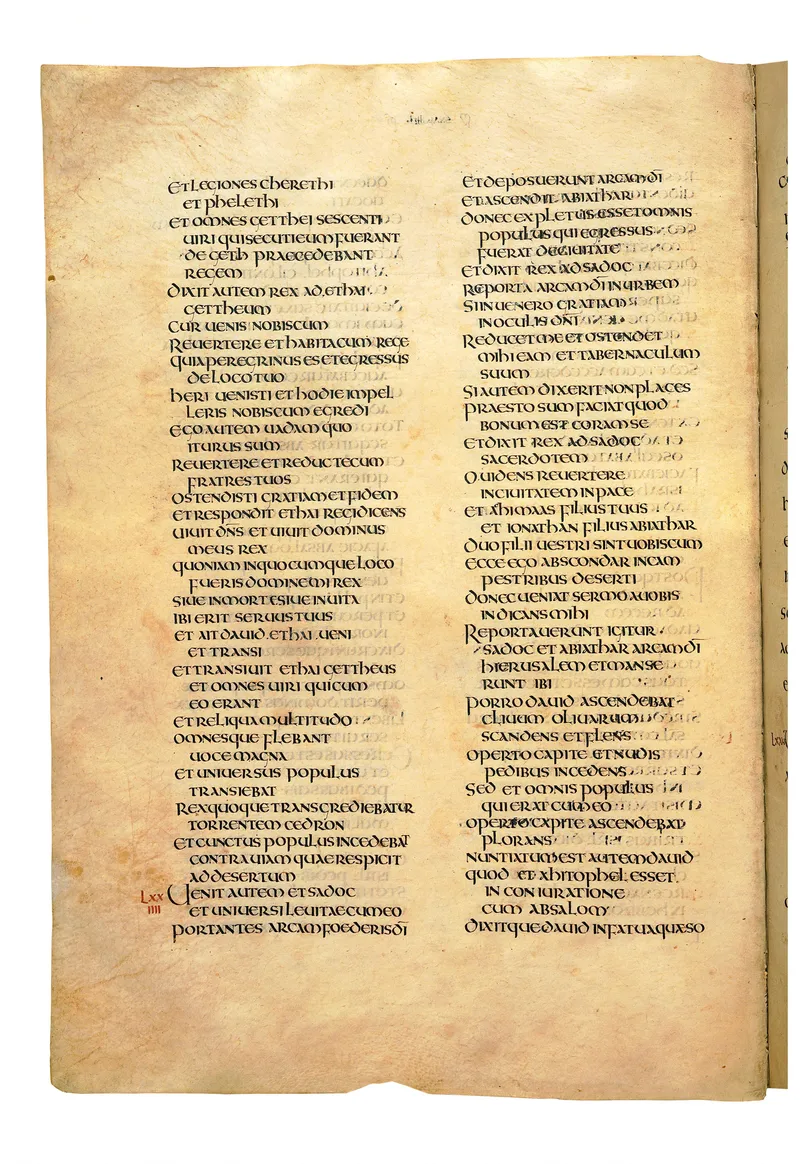 Folio of the Codex Amiatinus, the oldest surviving complete Latin Vulgate manuscript, made c. 700 AD at the twin Northumbrian monasteries of Monkwearmouth and Jarrow under Abbot Ceolfrith. Approximately corresponds to 2 Kings 25 in Vulgate book order. The page shows the actual eighth-century insular-uncial script as it would have been read by the monks who produced it for Pope Gregory II.