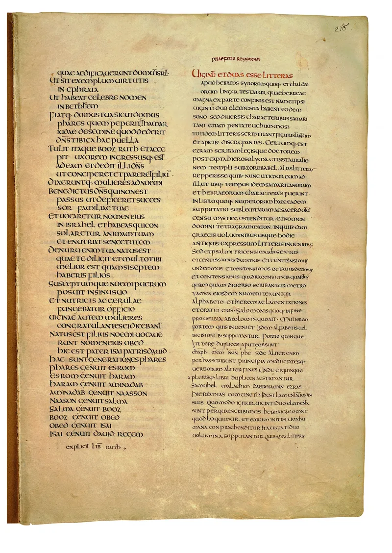 Folio of the Codex Amiatinus, the oldest surviving complete Latin Vulgate manuscript, made c. 700 AD at the twin Northumbrian monasteries of Monkwearmouth and Jarrow under Abbot Ceolfrith. Approximately corresponds to 2 Samuel 11 in Vulgate book order. The page shows the actual eighth-century insular-uncial script as it would have been read by the monks who produced it for Pope Gregory II.