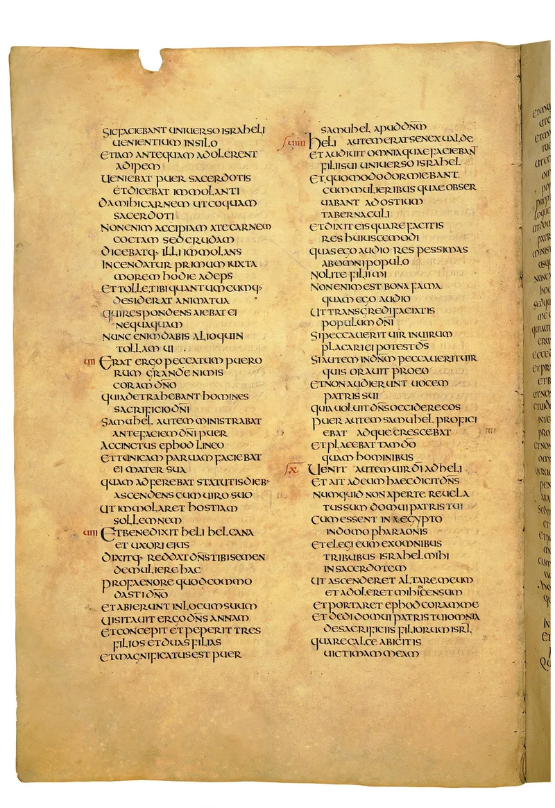Folio of the Codex Amiatinus, the oldest surviving complete Latin Vulgate manuscript, made c. 700 AD at the twin Northumbrian monasteries of Monkwearmouth and Jarrow under Abbot Ceolfrith. Approximately corresponds to 2 Samuel 17 in Vulgate book order. The page shows the actual eighth-century insular-uncial script as it would have been read by the monks who produced it for Pope Gregory II.