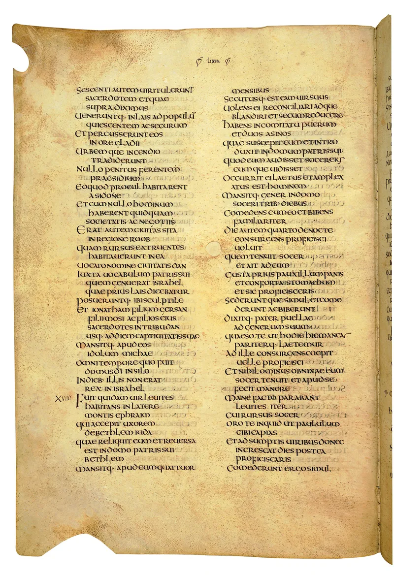 Folio of the Codex Amiatinus, the oldest surviving complete Latin Vulgate manuscript, made c. 700 AD at the twin Northumbrian monasteries of Monkwearmouth and Jarrow under Abbot Ceolfrith. Approximately corresponds to 2 Samuel 3 in Vulgate book order. The page shows the actual eighth-century insular-uncial script as it would have been read by the monks who produced it for Pope Gregory II.