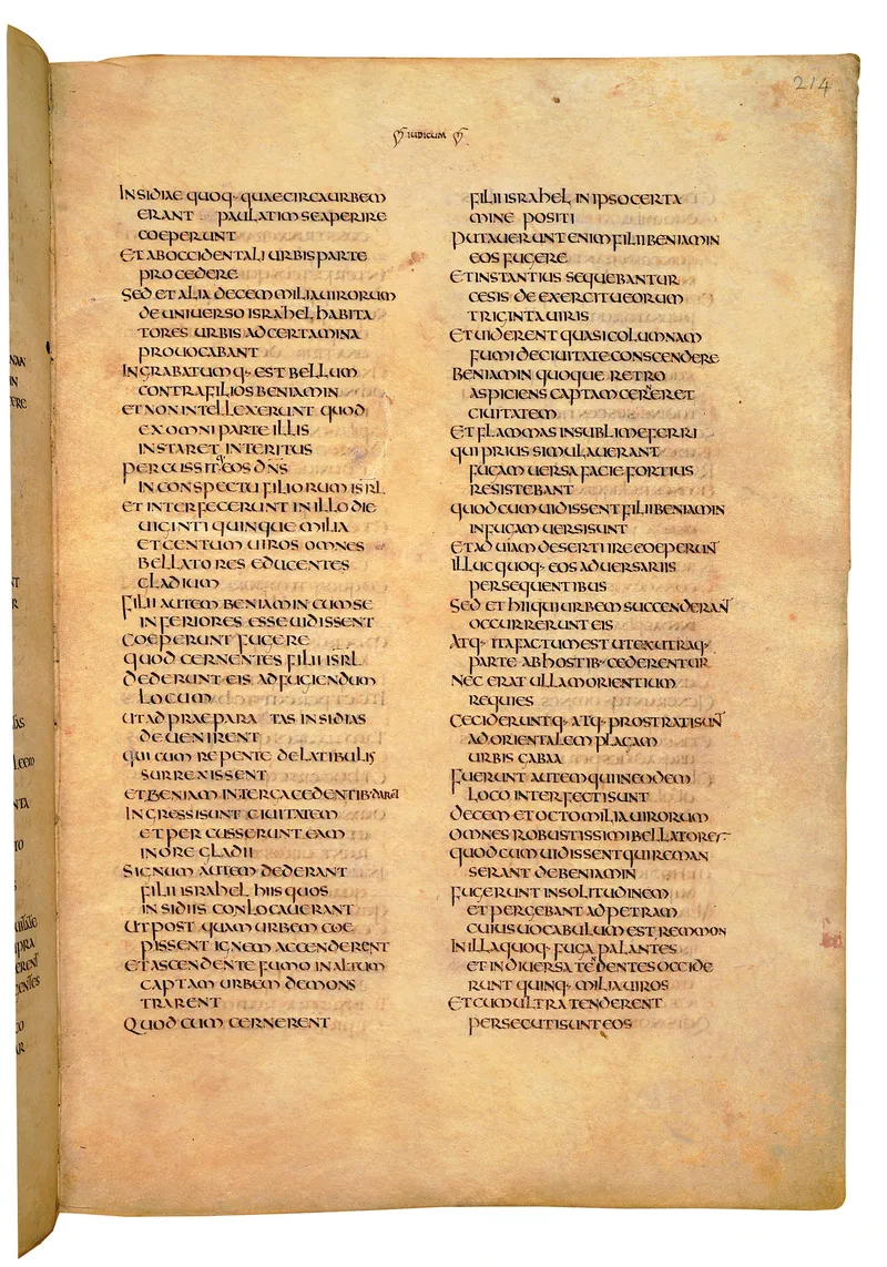 Folio of the Codex Amiatinus, the oldest surviving complete Latin Vulgate manuscript, made c. 700 AD at the twin Northumbrian monasteries of Monkwearmouth and Jarrow under Abbot Ceolfrith. Approximately corresponds to 2 Samuel 6 in Vulgate book order. The page shows the actual eighth-century insular-uncial script as it would have been read by the monks who produced it for Pope Gregory II.