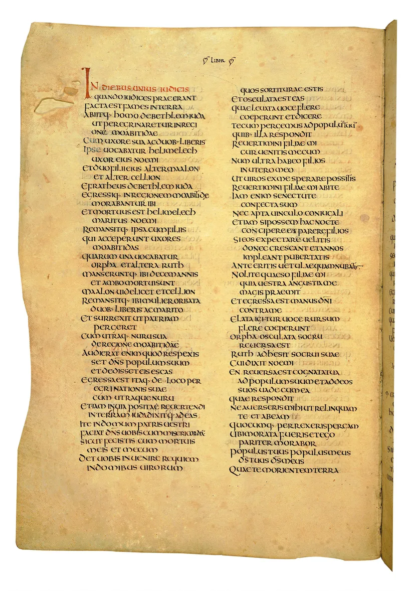 Folio of the Codex Amiatinus, the oldest surviving complete Latin Vulgate manuscript, made c. 700 AD at the twin Northumbrian monasteries of Monkwearmouth and Jarrow under Abbot Ceolfrith. Approximately corresponds to 2 Samuel 8 in Vulgate book order. The page shows the actual eighth-century insular-uncial script as it would have been read by the monks who produced it for Pope Gregory II.