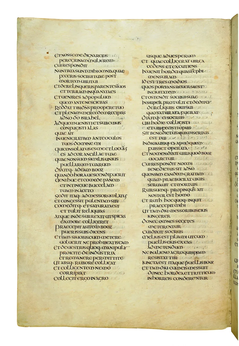 Folio of the Codex Amiatinus, the oldest surviving complete Latin Vulgate manuscript, made c. 700 AD at the twin Northumbrian monasteries of Monkwearmouth and Jarrow under Abbot Ceolfrith. Approximately corresponds to 2 Samuel 9 in Vulgate book order. The page shows the actual eighth-century insular-uncial script as it would have been read by the monks who produced it for Pope Gregory II.