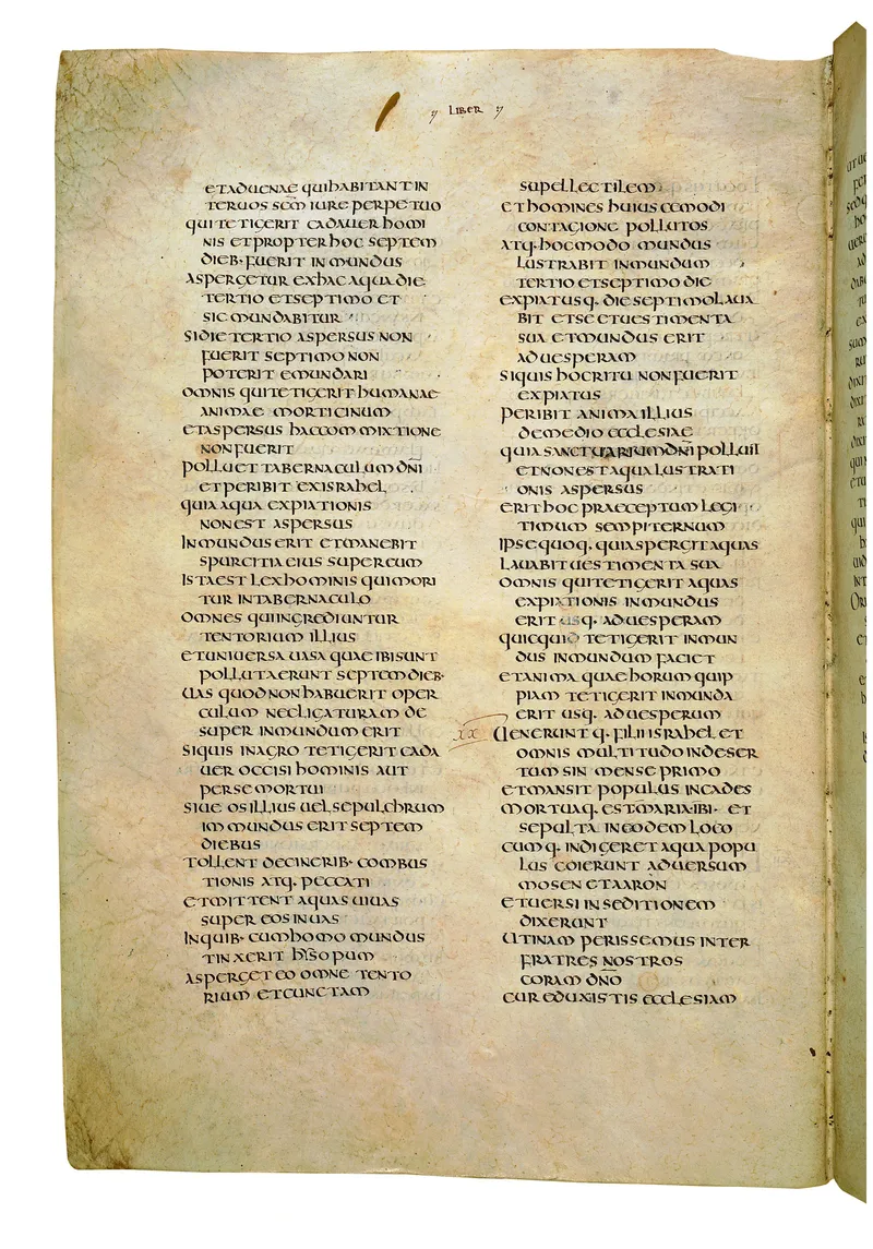 Folio of the Codex Amiatinus, the oldest surviving complete Latin Vulgate manuscript, made c. 700 AD at the twin Northumbrian monasteries of Monkwearmouth and Jarrow under Abbot Ceolfrith. Approximately corresponds to Deuteronomy 12 in Vulgate book order. The page shows the actual eighth-century insular-uncial script as it would have been read by the monks who produced it for Pope Gregory II.
