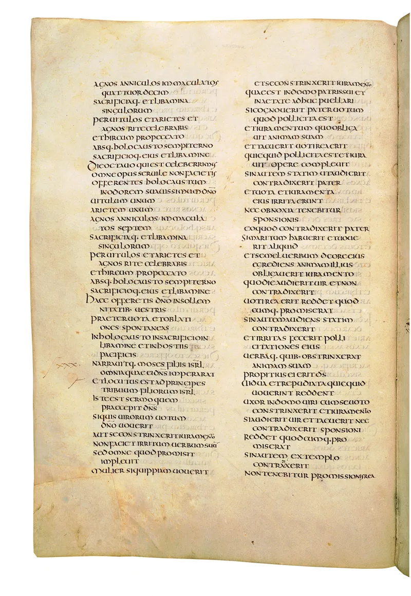 Folio of the Codex Amiatinus, the oldest surviving complete Latin Vulgate manuscript, made c. 700 AD at the twin Northumbrian monasteries of Monkwearmouth and Jarrow under Abbot Ceolfrith. Approximately corresponds to Deuteronomy 24 in Vulgate book order. The page shows the actual eighth-century insular-uncial script as it would have been read by the monks who produced it for Pope Gregory II.