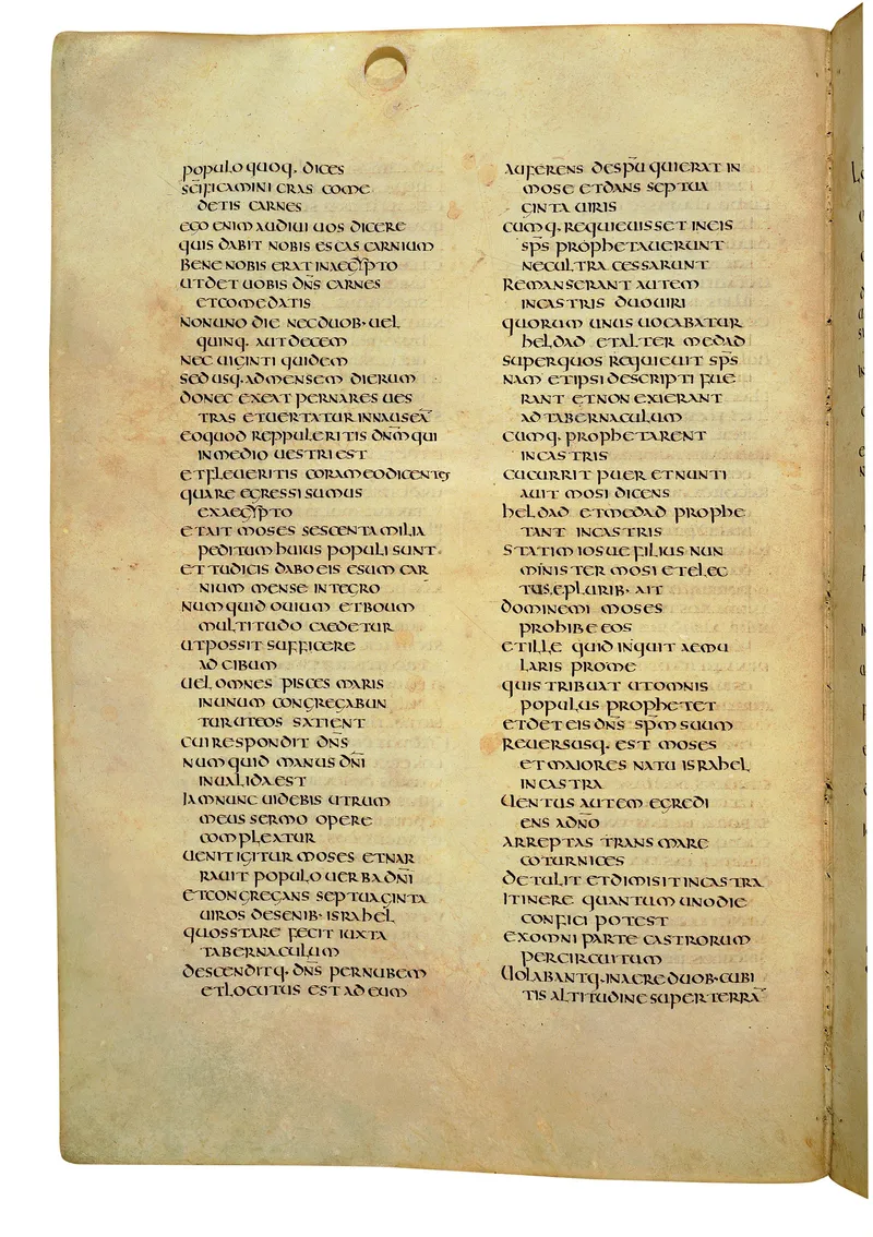 Folio of the Codex Amiatinus, the oldest surviving complete Latin Vulgate manuscript, made c. 700 AD at the twin Northumbrian monasteries of Monkwearmouth and Jarrow under Abbot Ceolfrith. Approximately corresponds to Deuteronomy 3 in Vulgate book order. The page shows the actual eighth-century insular-uncial script as it would have been read by the monks who produced it for Pope Gregory II.