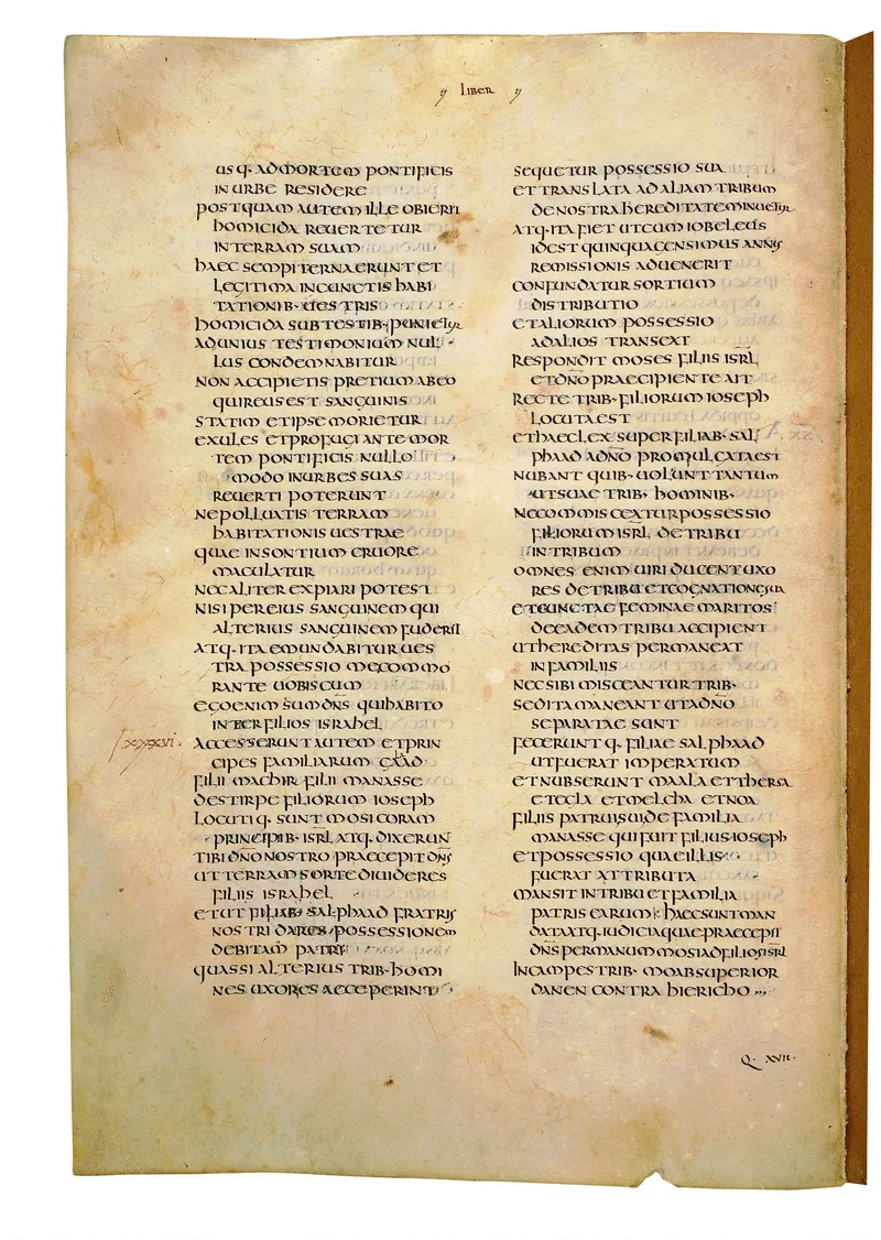 Folio of the Codex Amiatinus, the oldest surviving complete Latin Vulgate manuscript, made c. 700 AD at the twin Northumbrian monasteries of Monkwearmouth and Jarrow under Abbot Ceolfrith. Approximately corresponds to Deuteronomy 30 in Vulgate book order. The page shows the actual eighth-century insular-uncial script as it would have been read by the monks who produced it for Pope Gregory II.