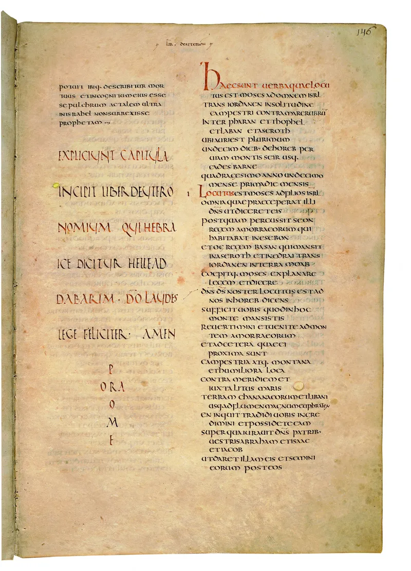 Folio of the Codex Amiatinus, the oldest surviving complete Latin Vulgate manuscript, made c. 700 AD at the twin Northumbrian monasteries of Monkwearmouth and Jarrow under Abbot Ceolfrith. Approximately corresponds to Deuteronomy 32 in Vulgate book order. The page shows the actual eighth-century insular-uncial script as it would have been read by the monks who produced it for Pope Gregory II.