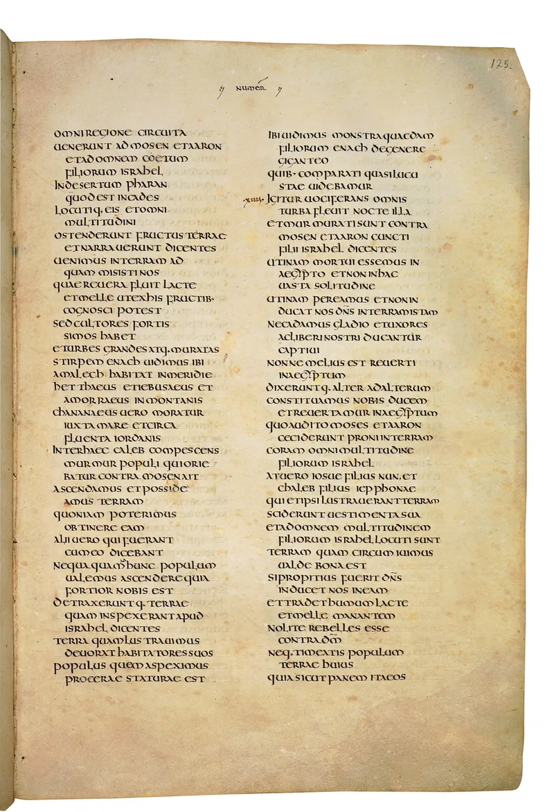 Folio of the Codex Amiatinus, the oldest surviving complete Latin Vulgate manuscript, made c. 700 AD at the twin Northumbrian monasteries of Monkwearmouth and Jarrow under Abbot Ceolfrith. Approximately corresponds to Deuteronomy 5 in Vulgate book order. The page shows the actual eighth-century insular-uncial script as it would have been read by the monks who produced it for Pope Gregory II.