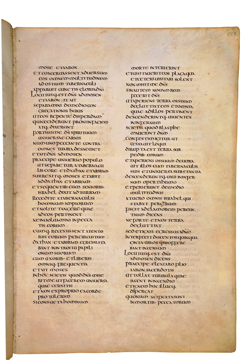 Folio of the Codex Amiatinus, the oldest surviving complete Latin Vulgate manuscript, made c. 700 AD at the twin Northumbrian monasteries of Monkwearmouth and Jarrow under Abbot Ceolfrith. Approximately corresponds to Deuteronomy 9 in Vulgate book order. The page shows the actual eighth-century insular-uncial script as it would have been read by the monks who produced it for Pope Gregory II.