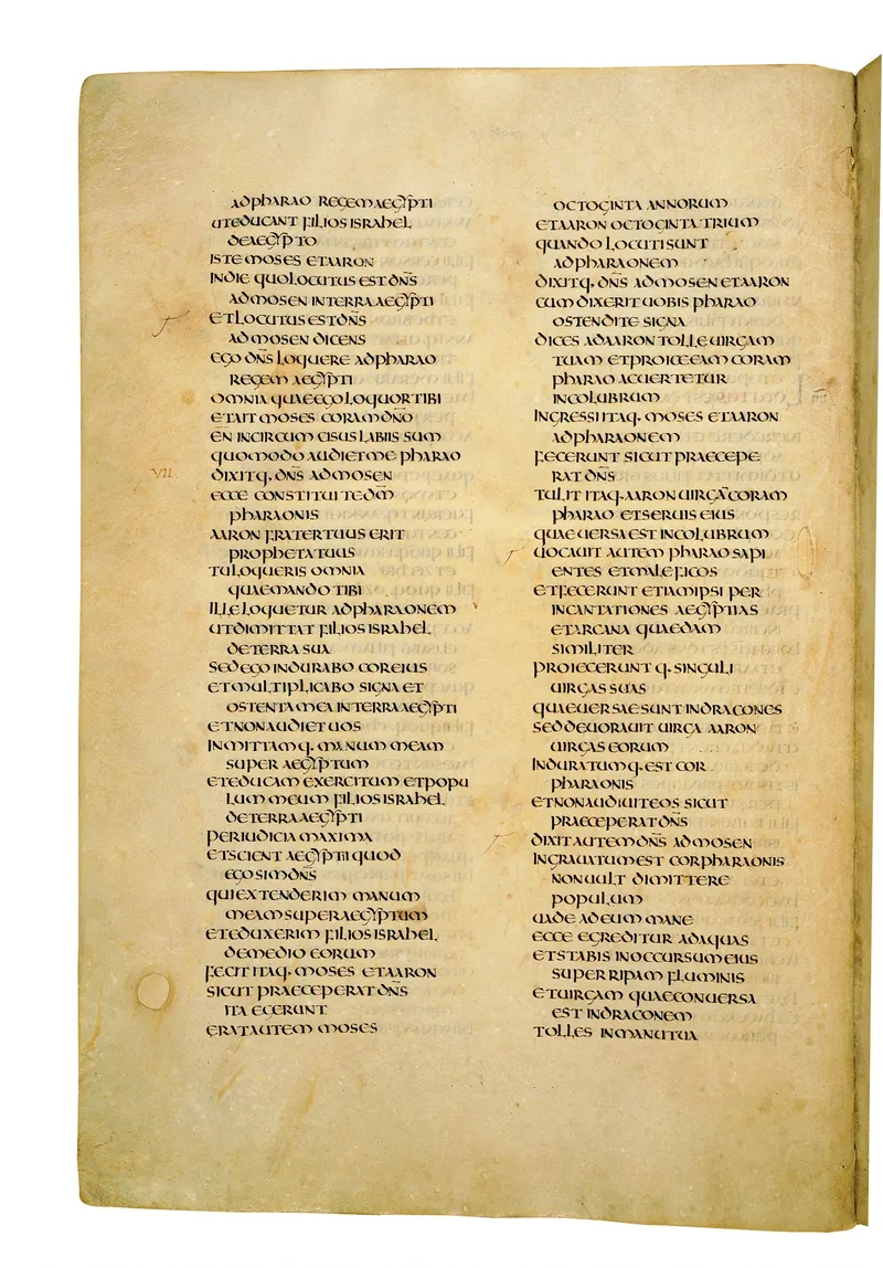 Folio of the Codex Amiatinus, the oldest surviving complete Latin Vulgate manuscript, made c. 700 AD at the twin Northumbrian monasteries of Monkwearmouth and Jarrow under Abbot Ceolfrith. Approximately corresponds to Exodus 18 in Vulgate book order. The page shows the actual eighth-century insular-uncial script as it would have been read by the monks who produced it for Pope Gregory II.