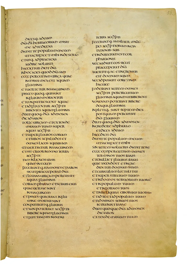 Folio of the Codex Amiatinus, the oldest surviving complete Latin Vulgate manuscript, made c. 700 AD at the twin Northumbrian monasteries of Monkwearmouth and Jarrow under Abbot Ceolfrith. Approximately corresponds to Exodus 19 in Vulgate book order. The page shows the actual eighth-century insular-uncial script as it would have been read by the monks who produced it for Pope Gregory II.