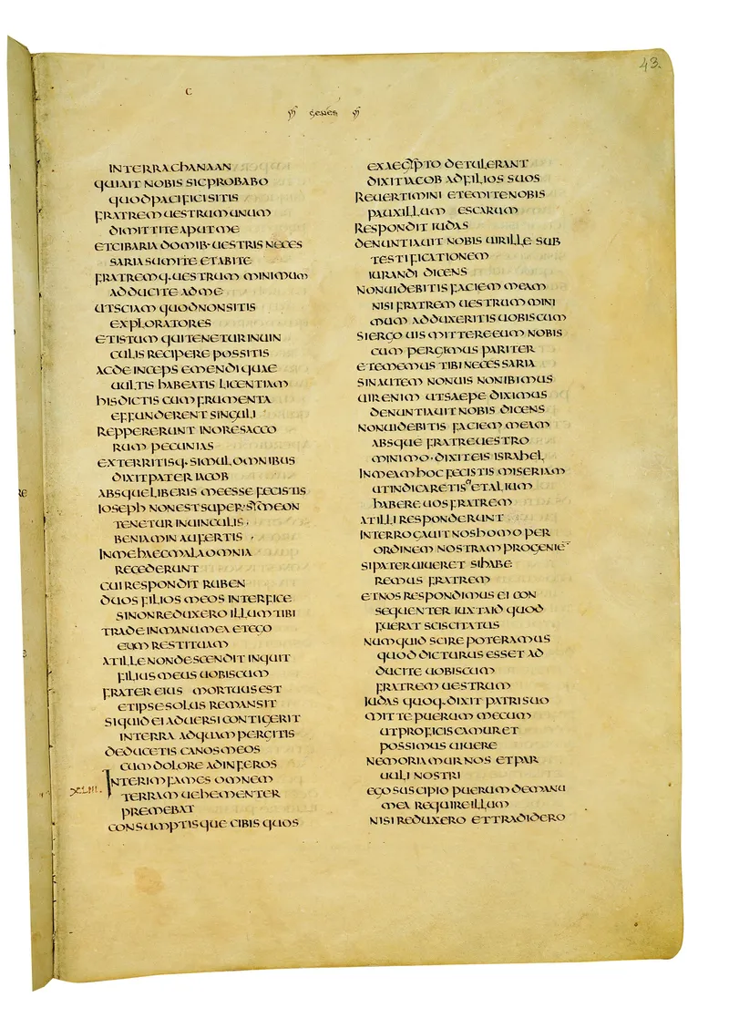Folio of the Codex Amiatinus, the oldest surviving complete Latin Vulgate manuscript, made c. 700 AD at the twin Northumbrian monasteries of Monkwearmouth and Jarrow under Abbot Ceolfrith. Approximately corresponds to Exodus 2 in Vulgate book order. The page shows the actual eighth-century insular-uncial script as it would have been read by the monks who produced it for Pope Gregory II.