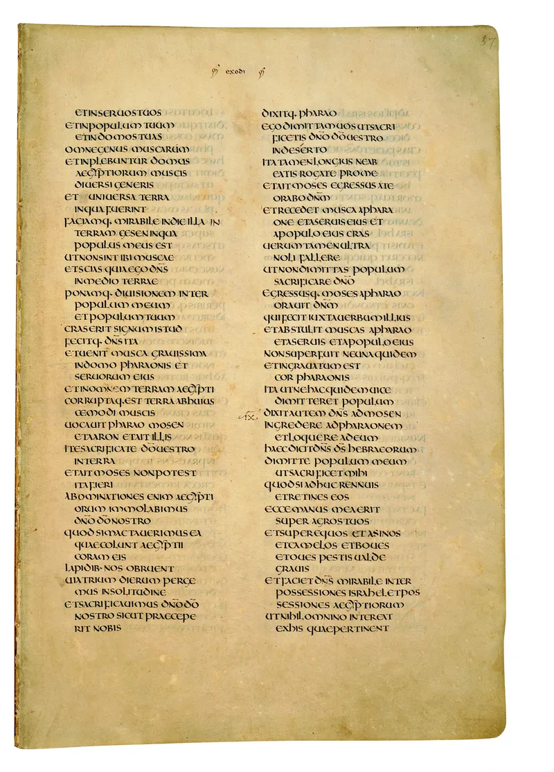 Folio of the Codex Amiatinus, the oldest surviving complete Latin Vulgate manuscript, made c. 700 AD at the twin Northumbrian monasteries of Monkwearmouth and Jarrow under Abbot Ceolfrith. Approximately corresponds to Exodus 20 in Vulgate book order. The page shows the actual eighth-century insular-uncial script as it would have been read by the monks who produced it for Pope Gregory II.