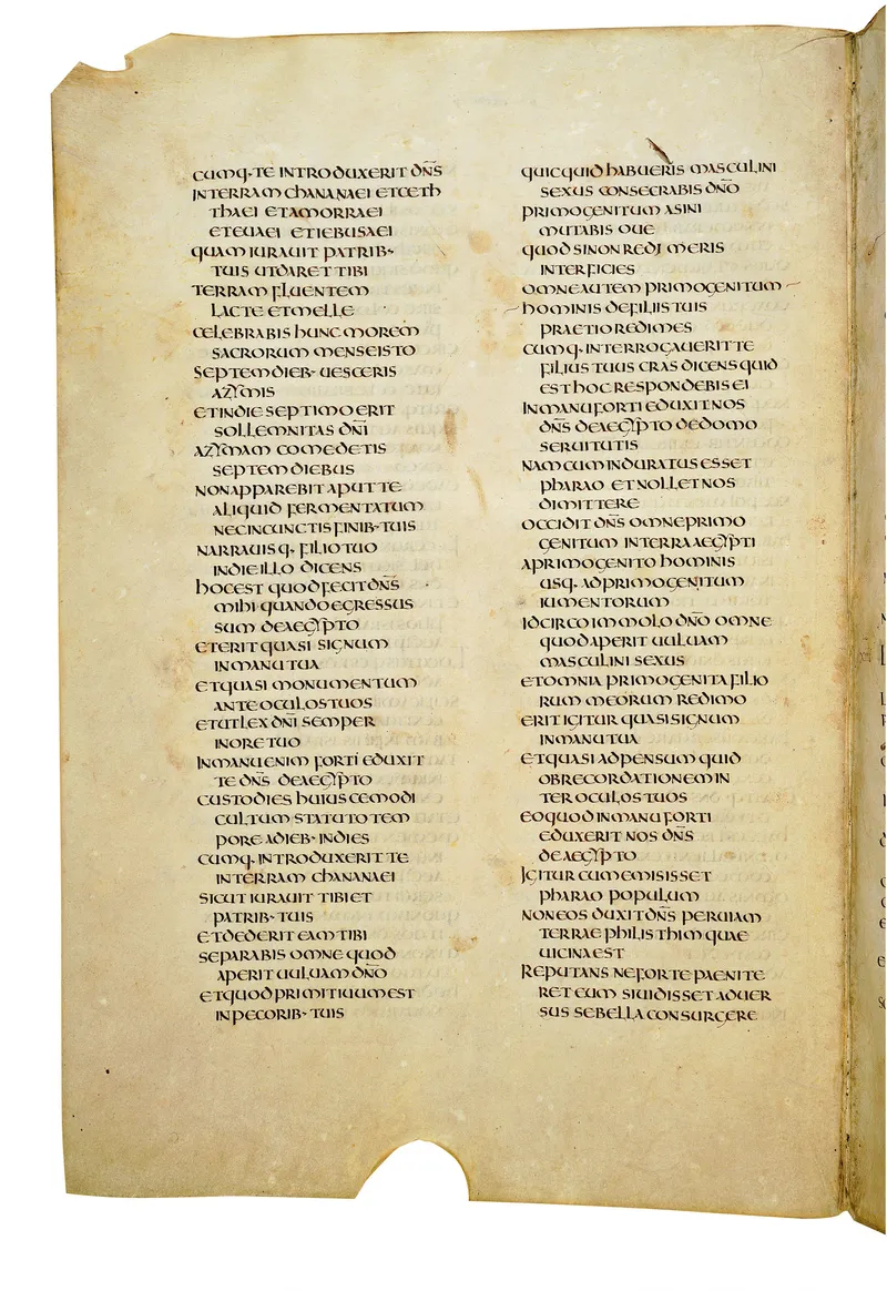 Folio of the Codex Amiatinus, the oldest surviving complete Latin Vulgate manuscript, made c. 700 AD at the twin Northumbrian monasteries of Monkwearmouth and Jarrow under Abbot Ceolfrith. Approximately corresponds to Exodus 26 in Vulgate book order. The page shows the actual eighth-century insular-uncial script as it would have been read by the monks who produced it for Pope Gregory II.