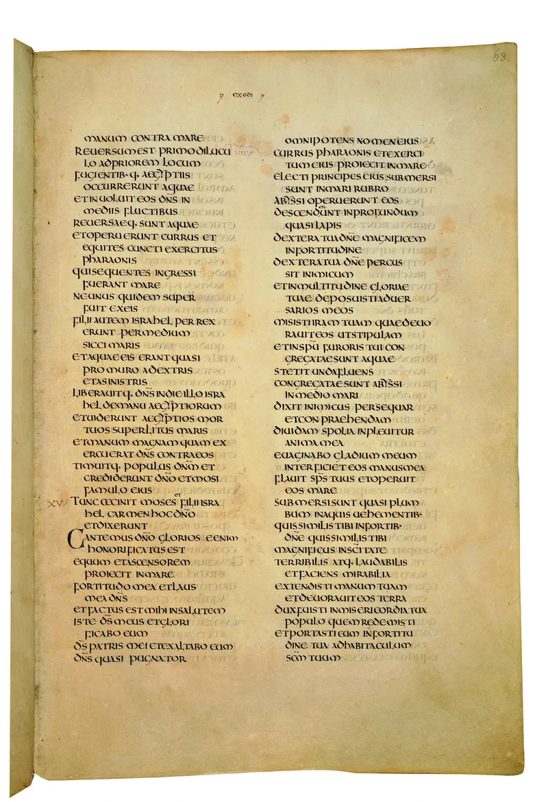 Folio of the Codex Amiatinus, the oldest surviving complete Latin Vulgate manuscript, made c. 700 AD at the twin Northumbrian monasteries of Monkwearmouth and Jarrow under Abbot Ceolfrith. Approximately corresponds to Exodus 28 in Vulgate book order. The page shows the actual eighth-century insular-uncial script as it would have been read by the monks who produced it for Pope Gregory II.