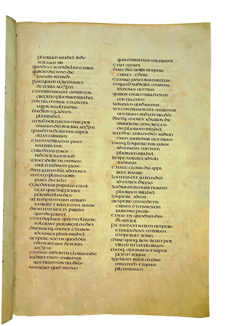 Folio of the Codex Amiatinus, the oldest surviving complete Latin Vulgate manuscript, made c. 700 AD at the twin Northumbrian monasteries of Monkwearmouth and Jarrow under Abbot Ceolfrith. Approximately corresponds to Exodus 29 in Vulgate book order. The page shows the actual eighth-century insular-uncial script as it would have been read by the monks who produced it for Pope Gregory II.