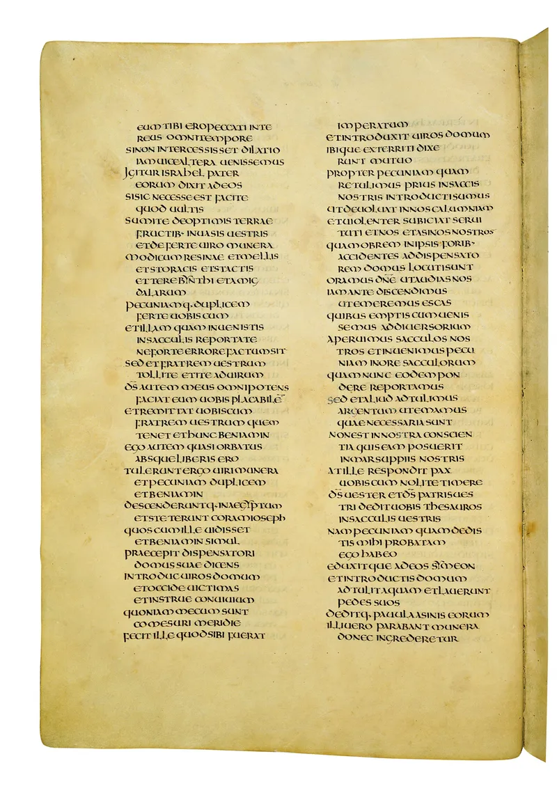 Folio of the Codex Amiatinus, the oldest surviving complete Latin Vulgate manuscript, made c. 700 AD at the twin Northumbrian monasteries of Monkwearmouth and Jarrow under Abbot Ceolfrith. Approximately corresponds to Exodus 3 in Vulgate book order. The page shows the actual eighth-century insular-uncial script as it would have been read by the monks who produced it for Pope Gregory II.