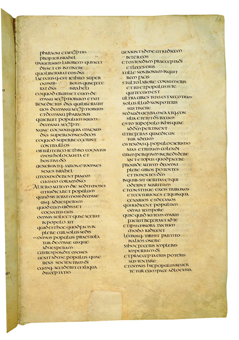 Folio of the Codex Amiatinus, the oldest surviving complete Latin Vulgate manuscript, made c. 700 AD at the twin Northumbrian monasteries of Monkwearmouth and Jarrow under Abbot Ceolfrith. Approximately corresponds to Exodus 32 in Vulgate book order. The page shows the actual eighth-century insular-uncial script as it would have been read by the monks who produced it for Pope Gregory II.