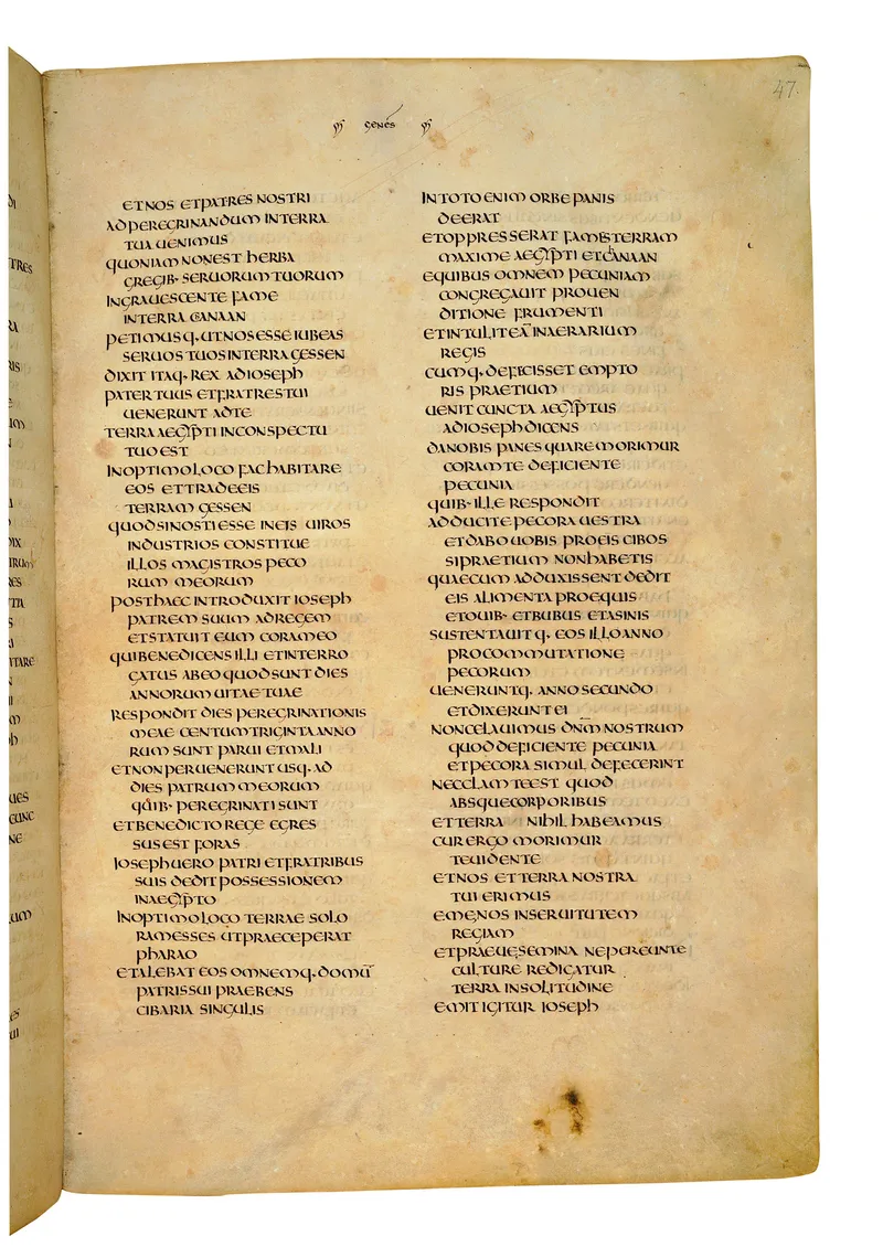 Folio of the Codex Amiatinus, the oldest surviving complete Latin Vulgate manuscript, made c. 700 AD at the twin Northumbrian monasteries of Monkwearmouth and Jarrow under Abbot Ceolfrith. Approximately corresponds to Exodus 7 in Vulgate book order. The page shows the actual eighth-century insular-uncial script as it would have been read by the monks who produced it for Pope Gregory II.