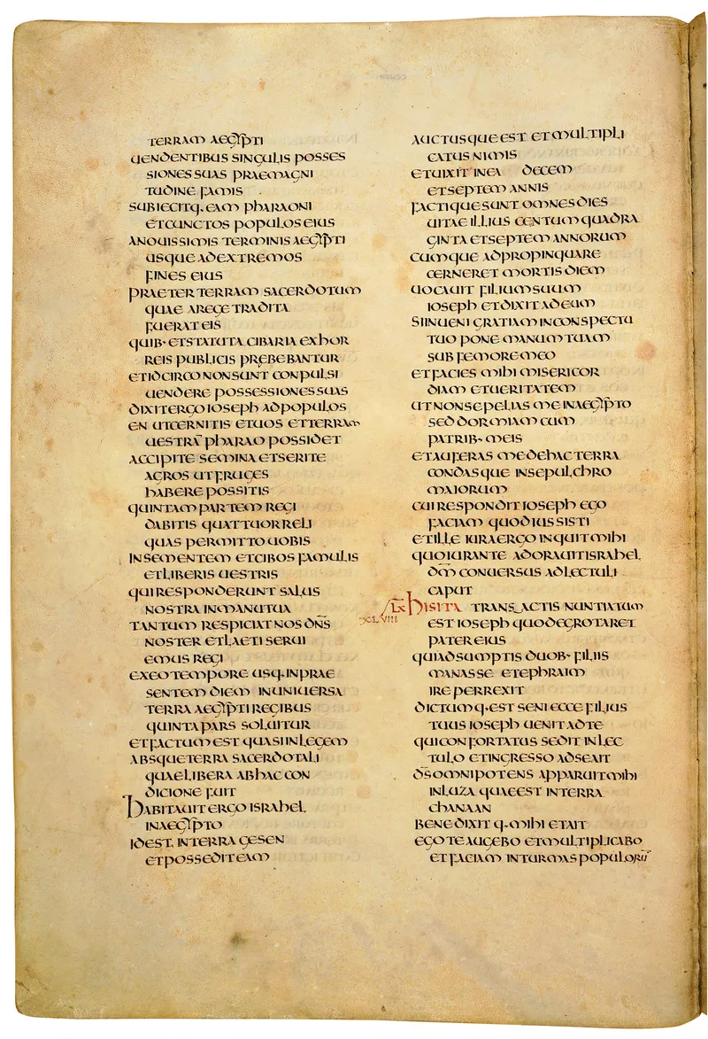 Folio of the Codex Amiatinus, the oldest surviving complete Latin Vulgate manuscript, made c. 700 AD at the twin Northumbrian monasteries of Monkwearmouth and Jarrow under Abbot Ceolfrith. Approximately corresponds to Exodus 8 in Vulgate book order. The page shows the actual eighth-century insular-uncial script as it would have been read by the monks who produced it for Pope Gregory II.